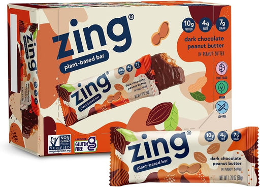 Zing BarDescriptionZing Dark Chocolate Peanut Butter Nutrition Bar is coated in real dark chocolate and offers 13g of protein in this 1.76oz snack. It is k...
