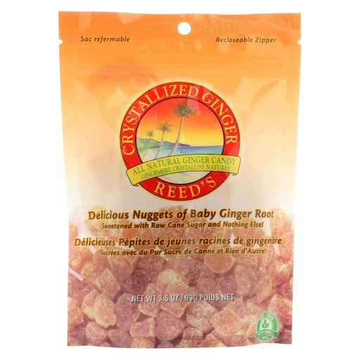 Description Reed's Crystallized Ginger is nuggets of baby ginger root sweetened with only raw cane sugar. Each 3.5 oz. bag of candy is made by harv...