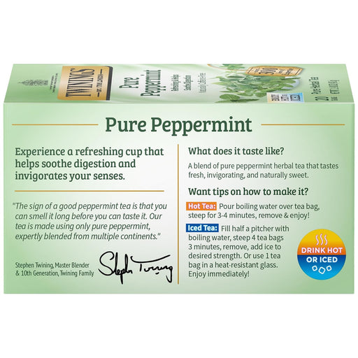 TwiningsDescription Twinings of London Pure Peppermint Herbal Tea fills your tea cup with refreshing mint flavor that's naturally caffeine-free for all-day...