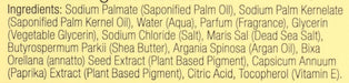 Sodium Palmate (Saponified Palm Oil); Sodium Palm Kernelate (Saponified Palm Kernel Oil); Water (Aqua); Parfum (Fragrance); Glycerin (Vegetable Glycerin); Sodium Chloride (Salt); Maris Sal (Dead Sea Salt); Butyrospermum Parkii (Shea Butter); Argania Spinosa (Argan Oil); Bixa Orellana (Annatto) Seed Extract (Plant Based Pigment); Capsicum Annuum (Paprika) Extract (Plant Based Pigment); Citric Acid; Tocopherol (Vitamin E)
