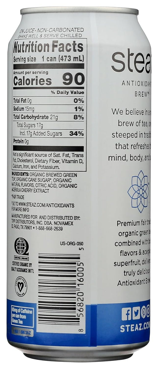 SteazDescription Steaz Iced Blueberry Pomegranate Green Tea is made with fair-trade and sustainable ingredients, so you can feel good about drinking it....