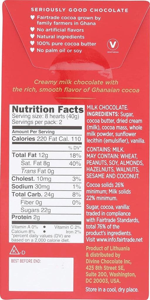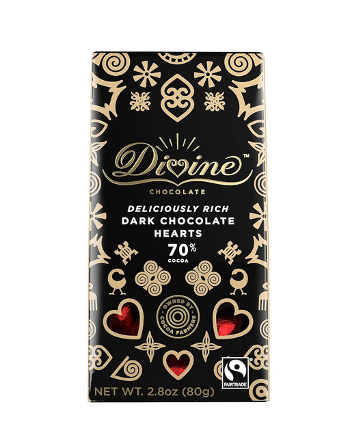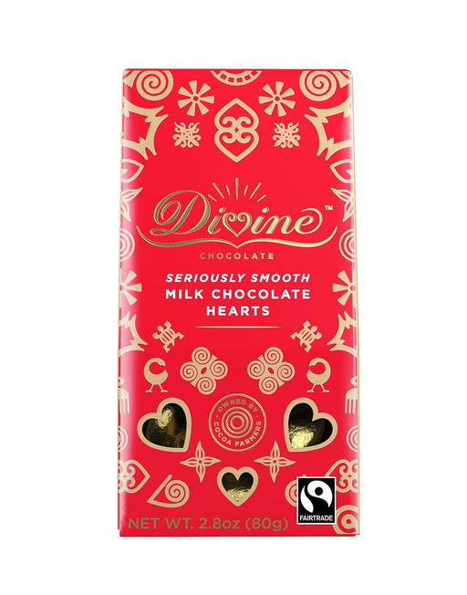 Divine ChocolateDescription Milk chocolate hearts made with the finest cocoa, smooth cocoa butter and real vanilla. Wrapped in gold foil revealed in chocolate brow...