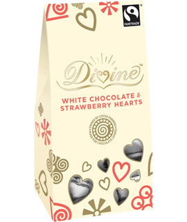 Divine ChocolateDescription White chocolate hearts made from the creamiest cocoa butter with crunchy pieces of real strawberry crisp wrapped in silver foil, glinti...