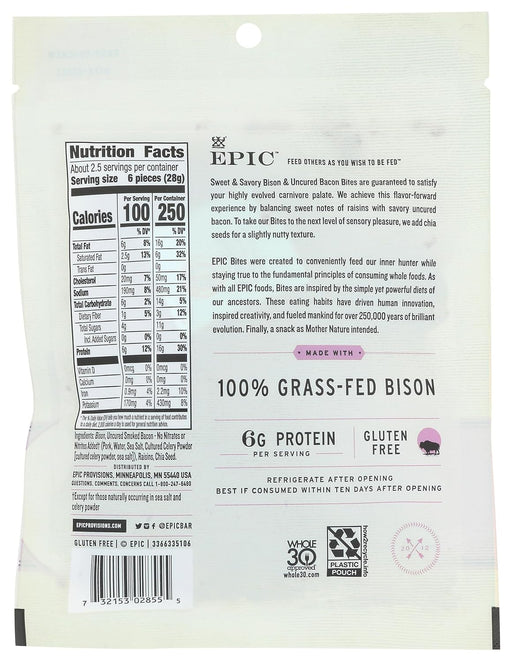 EpicDescription Epic Protein Bites, Bison Meat Uncured Bacon, Chia & Raisins is a convenient package of bite-sized protein snacks. This packet cont...