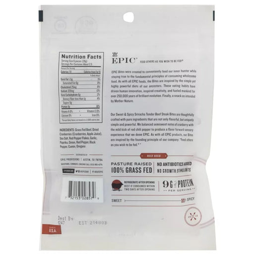 View full detailsEpic International Jerky Bites Sweet And Spicy Sriracha Tender Beef Steak 2.5 oz