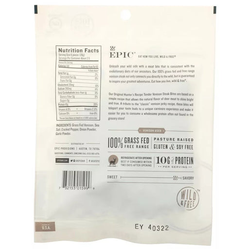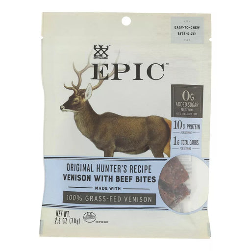 EpicDescription Epic Bites Original Hunter's Recipe Tender Venison Steak Bites bring the taste of rich game meat to snack time. We source this meat fro...