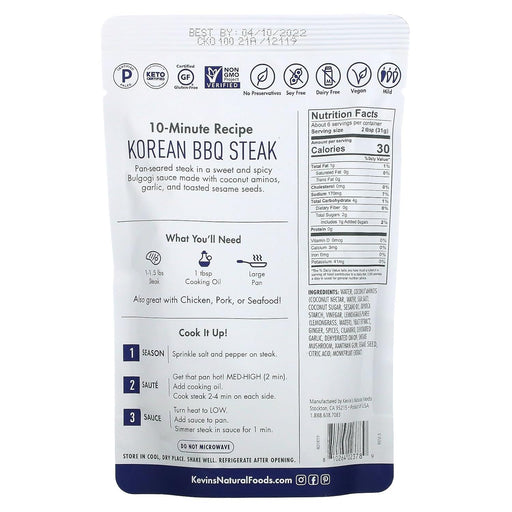 Kevin`s Natural FoodsDescription Take your favorite meats to the next level. Kevin's Natural Foods makes its sweet and spicy Korean Bulgogi sauce with coconut aminos, ...