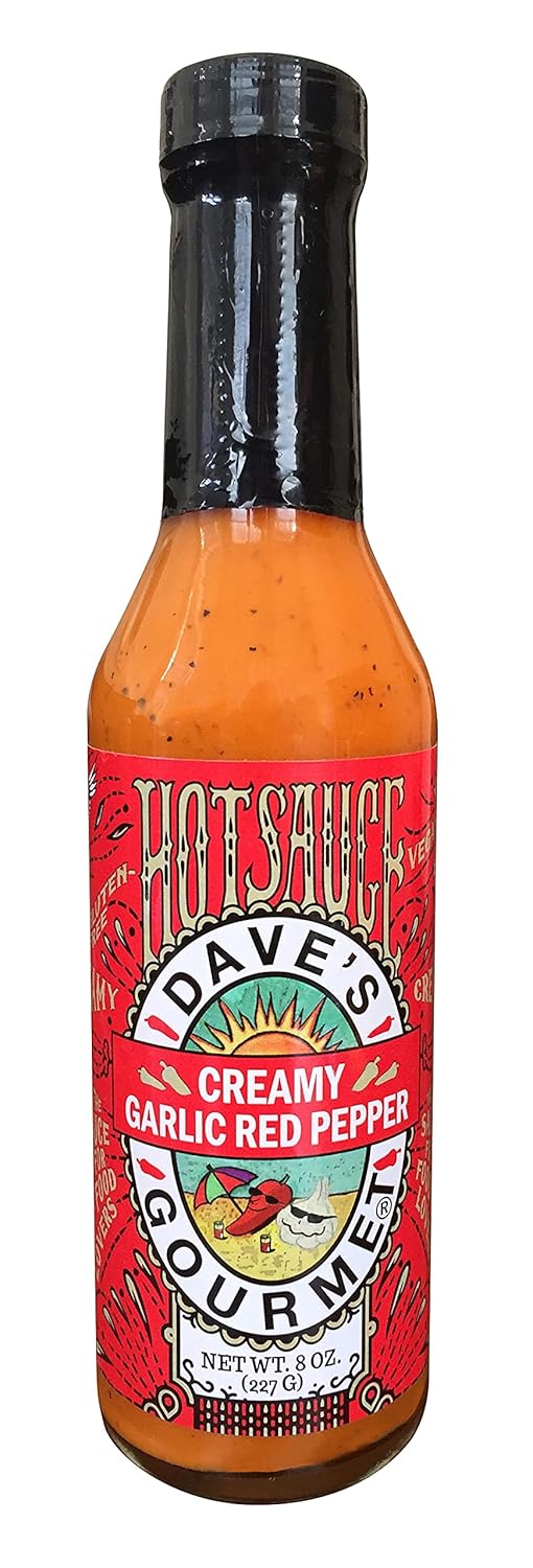 Dave`s GourmetDescription Dave's Gourmet Hot Sauce, Creamy Garlic Red Pepper is the sauce for food lovers. A blend of spicy red chilies, sweet roasted peppers an...