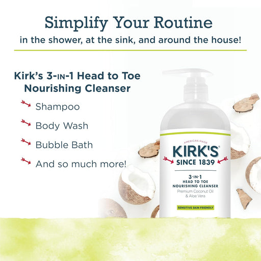 Kirk`sDescription Enhanced with premium Coconut Oil and soothing Aloe Vera, our 3-in-1 cleanser leaves you feeling soft and healthy – from head to toe. K...