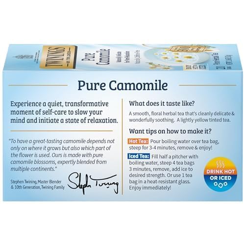 TwiningsDescription Twinings of London Pure Camomile Herbal Tea contains only camomile blossoms for a pure beverage. Designed to promote relaxation, this h...