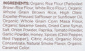 Brown Rice, Pregelatinized Rice Flour, Rice Flour, Organic Masa Corn Flour, High Oleic, Expeller-Pressed Safflower Or Sunflower Oil, Modified Food Starch, Organic Sesame Seeds, Evaporated Cane Juice, Sea Salt, Dehydrated Vegetables (Onion, Tomato, Garlic), Paprika, Ginger, Cayenne Pepper, Torula Yeast, Honey, Yeast Extract, Citric Acid, Tricalcium Phosphate (Anticaking Agent), Natural Hickory Smoke Flavor, Natural Caramel Color.