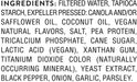 Filtered Water, Tapioca Starch, Expeller Pressed: Canola And/or Safflower Oil, Coconut Oil, Vegan Natural Flavors, Salt, Pea Protein, Tricalcium Phosphate, Cane Sugar, Lactic Acid (Vegan), Xanthan Gum, Titanium Dioxide Color (Naturally Occurring Mineral), Yeast Extract, Black Pepper, Onion, Garlic, Parsley.