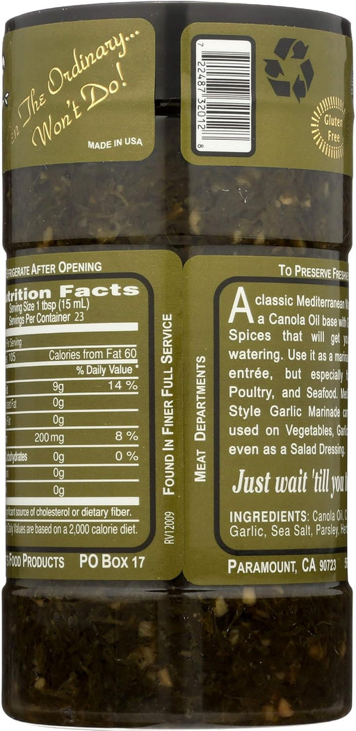 Description Scott's Food Products Mediterranean Garlic Marinade features a canola oil base blended with garlic and spices for a delicious addition ...