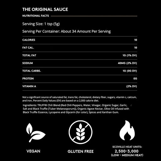 TruffDescription TRUFF Hot Sauce is a curated blend of ripe chili peppers, organic agave nectar, black truffle, and savory spices. The combination of in...