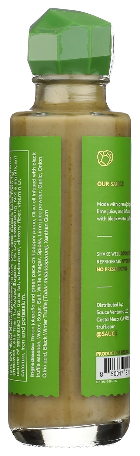 TruffDescription Green jalapeño and green pace chili pepper puree, olive oil infused with black truffle essence, water, sugar, salt, white vinegar, spic...