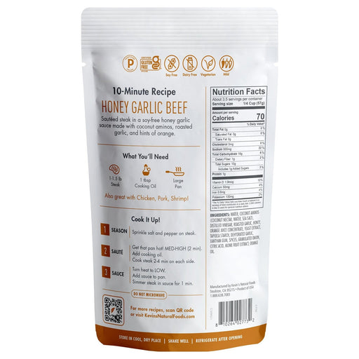 Kevin`s Natural FoodsDescription A soy-free honey garlic sauce made with coconut aminos, roasted garlic, and hints of orange. Ingredients N/A Nutrition Information...