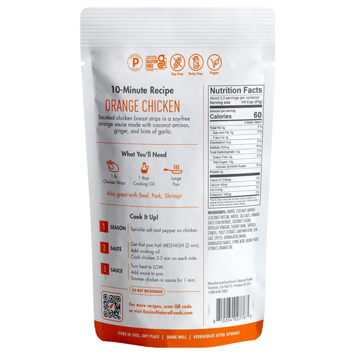 Kevin`s Natural FoodsDescription A soy-free orange sauce made with coconut aminos, ginger, and hints of garlic. Ingredients N/A Nutrition Information Natural Dair...