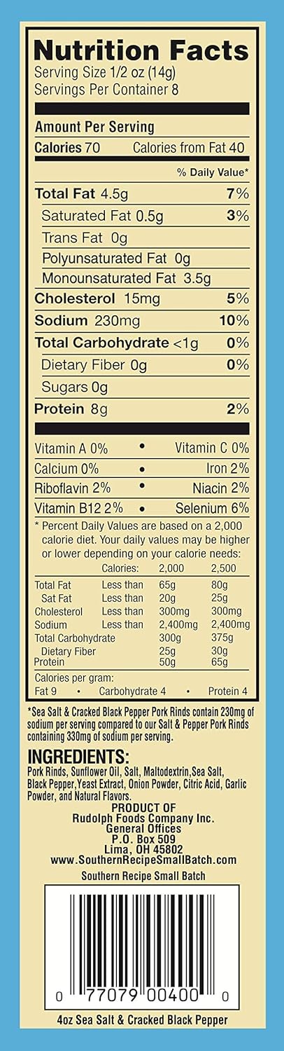 View full detailsSouthern Recipe Small Batch Small Batch Pork Rind Sea Salt Cracked Pepper 4 Oz