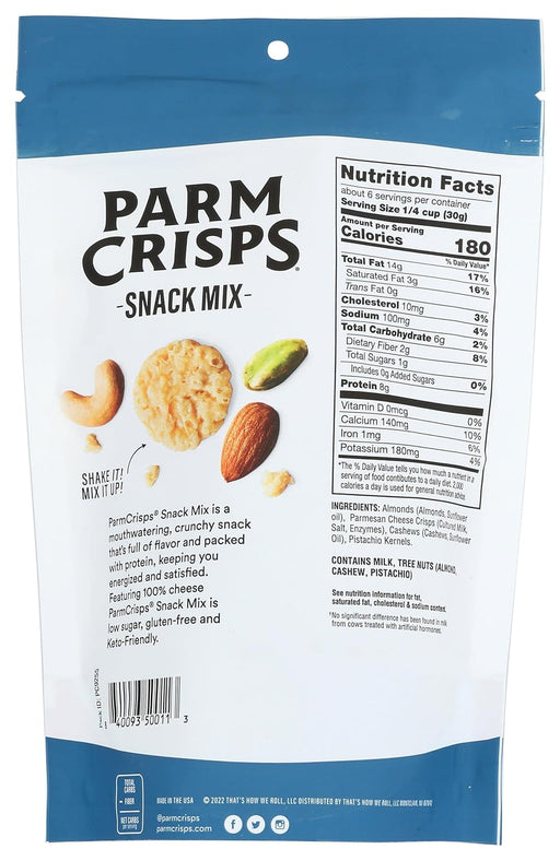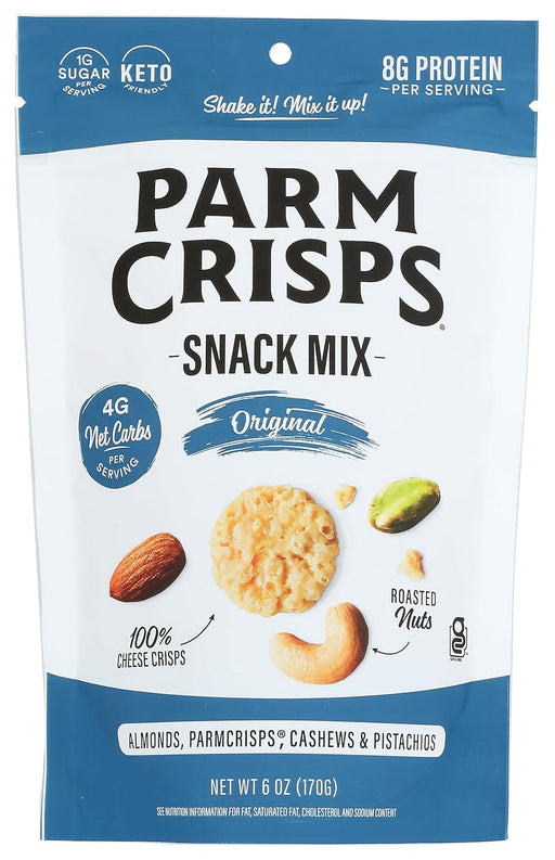 Parm CrispsDescription Always Keto Friendly. Dry Roasted Nuts. 100% Cheese Crisps. 1g Sugar. 4g Carbs. 10g Protein. Gluten Free. ParmCrisps Snack Mix Original...
