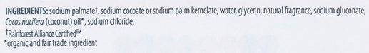 Sodium Palmate (Rainforest Alliance Certified), Sodium Cocoate Or Sodium Palm Kernelate, Water, Glycerin, Natural Fragrance, Sodium Gluconate, Cocos Nucifera (Coconut) Oil (Organic And Fair Trade Ingredient), Sodium Chloride.