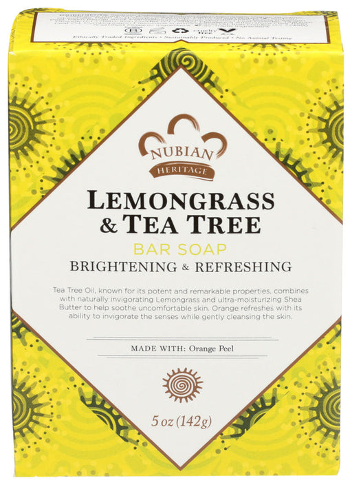 Nubian HeritageDescription Nubian Heritage Lemongrass & Tea Tree Soap is a delightful blend of organic ingredients that help keep your skin bright and healthy...