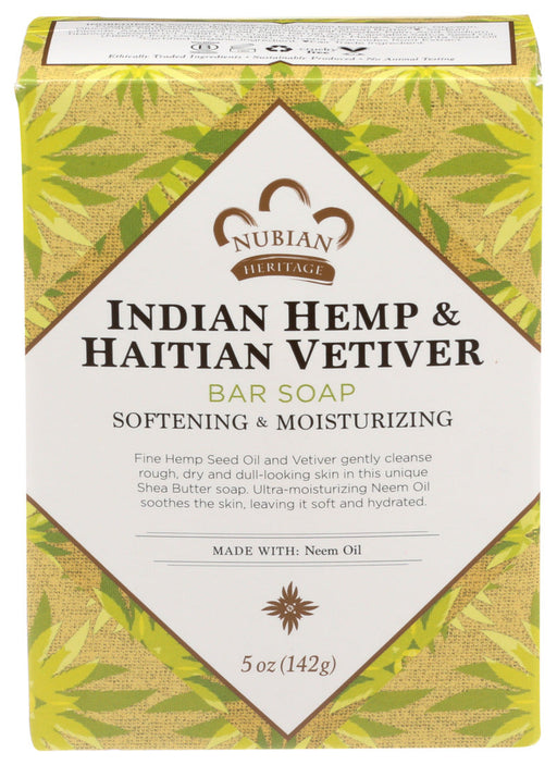 Nubian HeritageDescription Fine hemp seed oil and vetiver gently cleanse rough dry and dull-looking skin in this unique shea butter soap. Ultra-moisturizing neem...