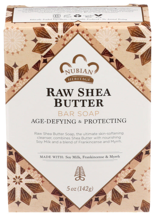 Nubian HeritageDescription Nubian Heritage NHO Raw Shea Bar Soap combines rich shea butter with soy milk and a blend of frankincense and myrrh to offer an age-de...